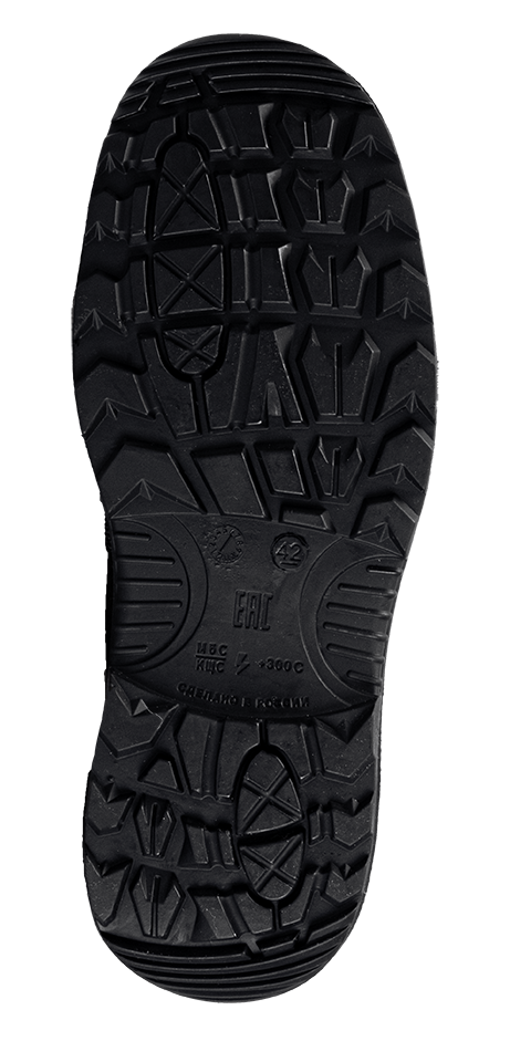 -Ходовой слой подошвы из износостойкой, термостойкой (до +300°С в течение 60 сек.), морозостойкой (-40 °С) нитрильной резины, стойкой к деформациям и истиранию.