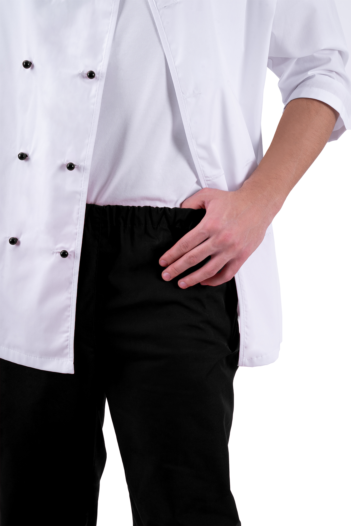 Комплект состоит из куртки, брюк, фартука, колпака