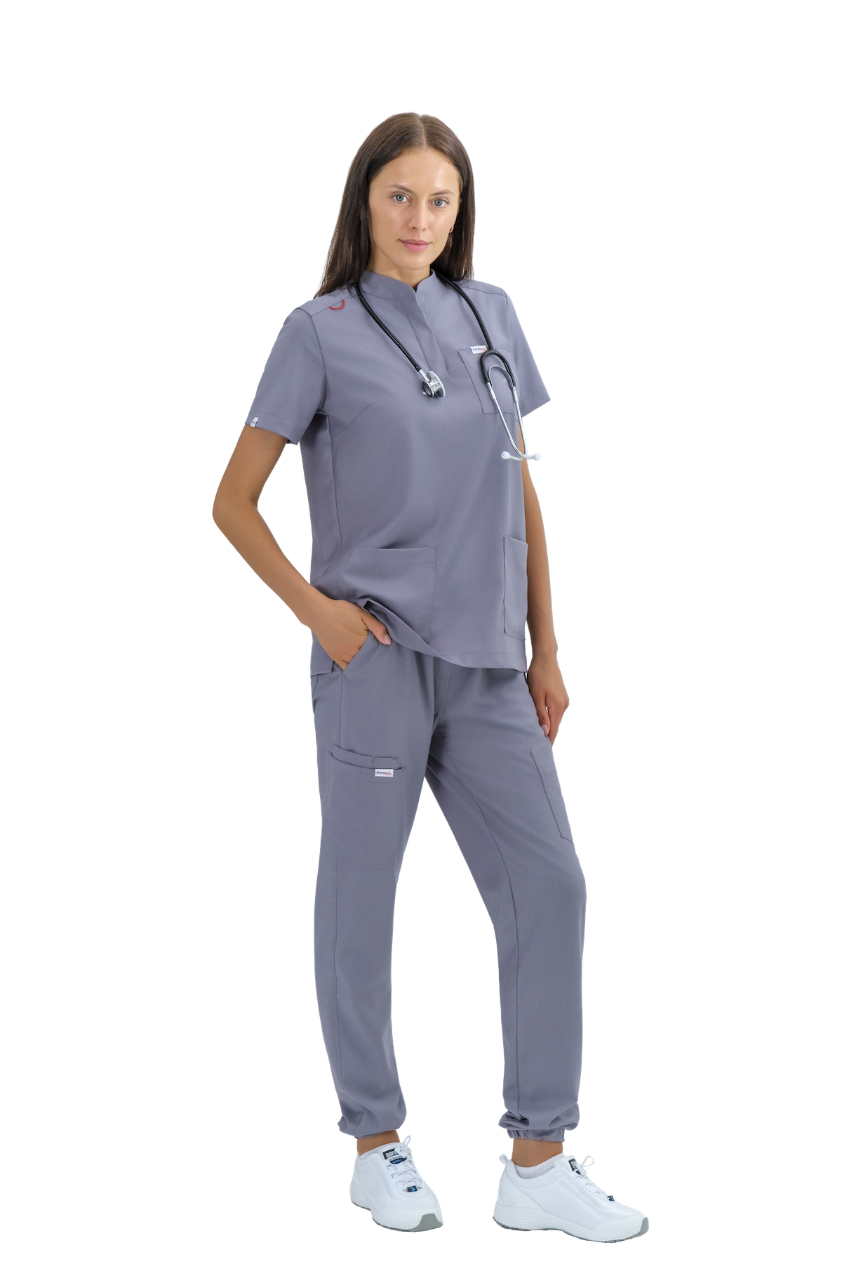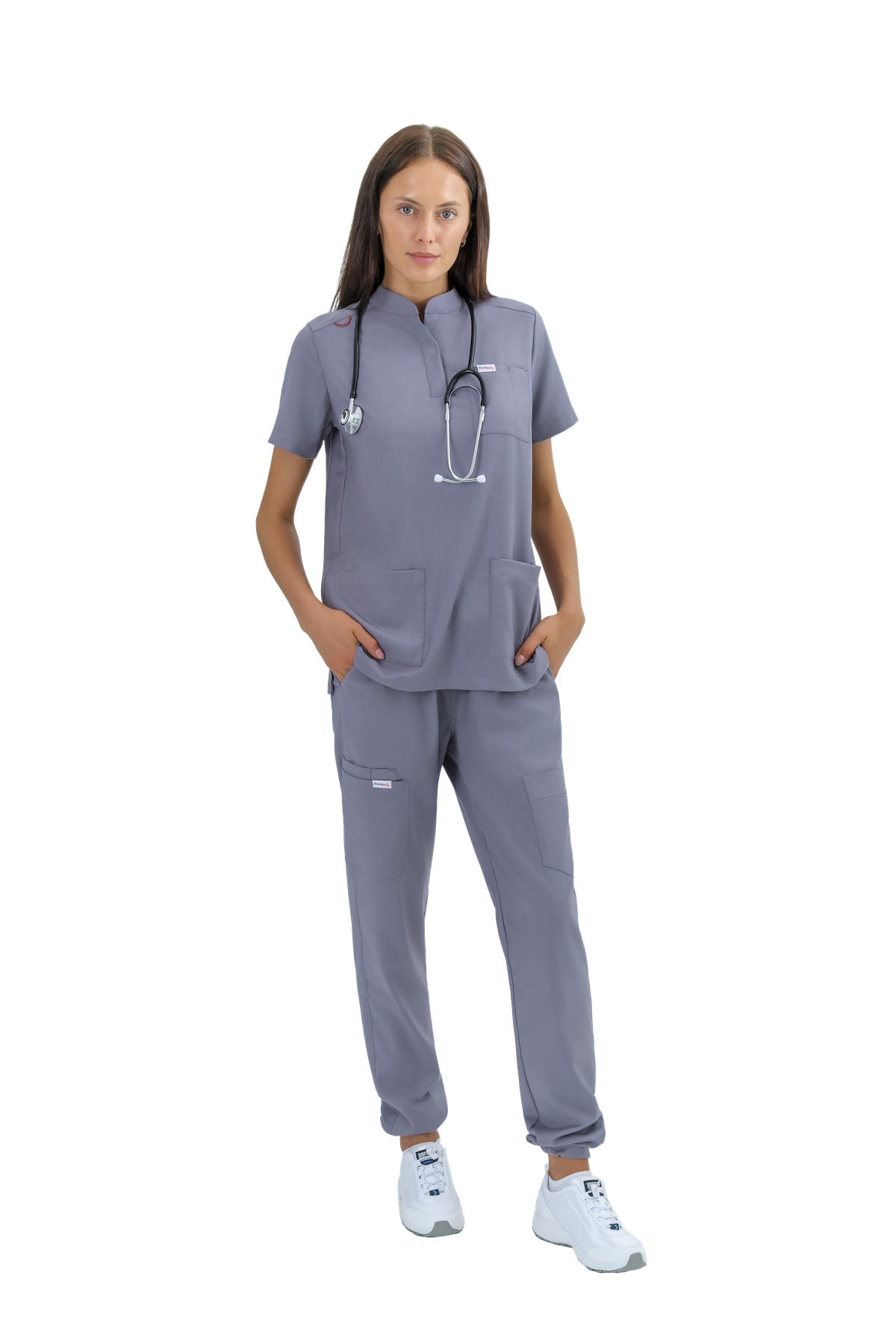 На уровне боковых швов расположены 3 накладных кармана: левый -накладной карман фигурной формы вход в карман с застежкой-молния, правый -большой накладной карман фигурной формы  и малый накладной карман расположен под правым большим карманом, вход в карман разделенный на две секции.
